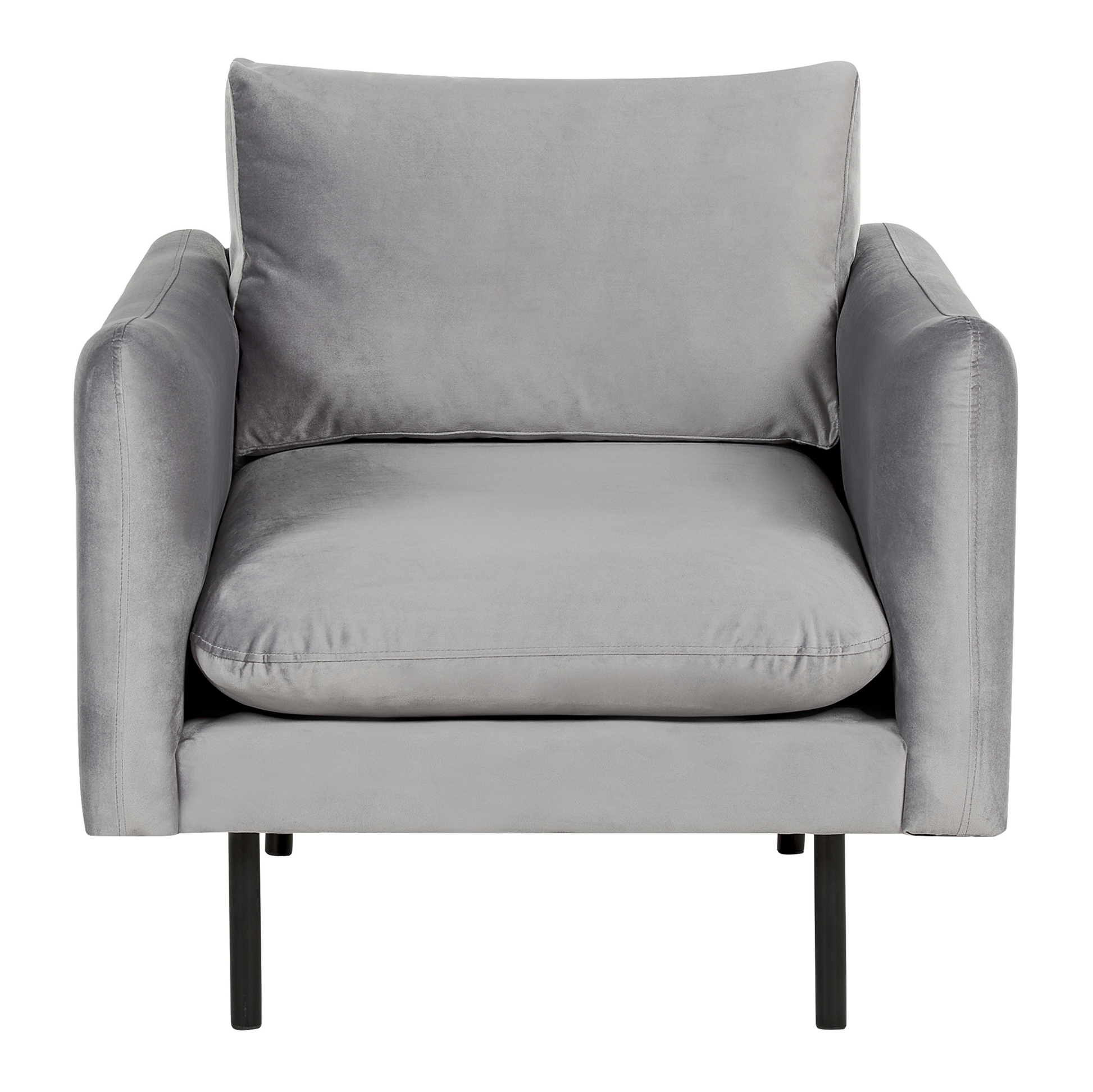 Dieser schlichte Wohnzimmersessel ist der Inbegriff von modernem Design. Es verfügt über eine robuste Holzkonstruktion, die für Stabilität sorgt, während der geschmeidige Samtbezug mit seinem unverwechselbaren Schimmer besondere Eleganz verspricht. Dank des dicken, losen Sitz- und Rückenkissens sowie den schmalen, hohen Armlehnen können Sie mit einem optimalen Sitzkomfort rechnen. Zudem sind die Kissenhüllen abnehmbar, so ist die Pflege des Sessels ein Kinderspiel. Seine schmalen, schwarzen Metallbeine geben dem Polstersessel eine besondere Leichtigkeit – perfekt für eine stilvolle Einrichtung.  Material: Samtstoff. Zusätzliches Material: Aluminium, Kiefernholz, Sperrholz.  Material Zusammensetzung: 100% Polyester Gewicht: 25 Montage: Beine / Füsse nicht montiert Holzart: Pinus massoniana Holzursprung: Kanada Gewichtskapazität: 120 Kissen Abmessungen: 40x67 Polsterstärke: 16 Sitzhöhe: 44 Das Angebot beinhaltet: 1 x Sessel Sitzfläche: 60x60 Höhe: 86 zusätzliche Information: Um sicherzustellen, dass die Konstruktion stabil und die Nutzungssicherheit gewährleistet ist, sollte man 2 Wochen nach dem Zusammenbau überprüfen, ob die Ware auch korrekt montiert wurde. Ausserdem ist alle 3 Monate zu prüfen, ob die Schrauben richtig festgezogen sind., Die Beine befinden sich in einer praktischen Tasche unter dem Sitz., Bitte beachten Sie, dass Samtstoff unter verschiedenen Lichtverhältnissen eine andere Optik haben kann – das Material schimmert bei Tageslicht stärker und wirkt bei künstlicher Beleuchtung in Innenräumen eher gedämpft. Aufgrund der glatten, hochdichten Struktur des Gewebes kann sein Farbton auch variieren, wenn man mit der Hand in verschiedene Richtungen und Winkel über den Stoff fährt. Um den Farbton auszugleichen und Druckstellen zu vermeiden, sollte der Webstoff sanft mit einer offenen Handfläche in eine Richtung gestrichen, mit einem feuchten Tuch abgewischt oder einem Dampfbügeleisen gebügelt werden. Breite: 83 Tiefe: 84 Art: Sessel Stil: Modern Allgemeine Farbe: Grau Muster: Ohne Muster Hauptmaterial: Samtstoff Füllmaterial: Schaumstoff Arm Stil: Gerade