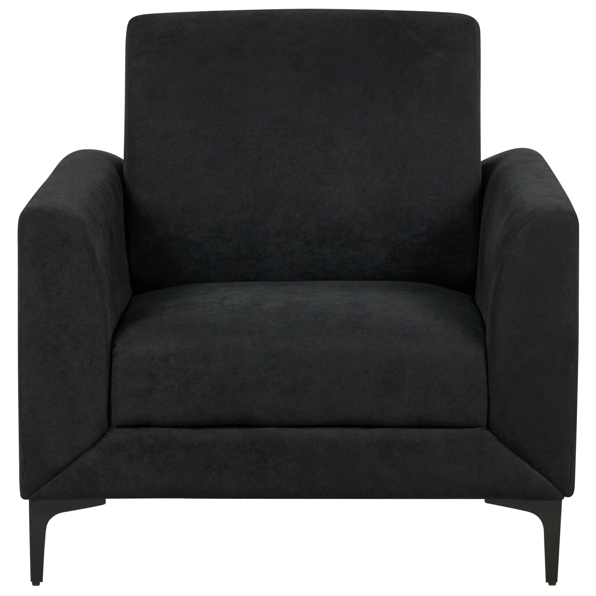 Dieser bequeme, aussergewöhnlich stilvolle Sessel bietet einen zeitlosen Look, der mit einem weichen Stoffbezug und robusten Metallbeinen gepaart wird. Dabei punktet er auch mit seiner tiefen Sitzfläche, hohen Rückenlehne, seinem dicken Sitzkissen und seinen breiten Armlehnen. Seine schwarzen, schlanken Füsse bilden nicht nur das i-Tüpfelchen bei seinem Design, sie sind auch mit Schutzkappen ausgestattet, so kann der Polstersessel auch ohne Bedenken auf dem Boden verschoben werden. Dank seiner klassischen Formgebung lässt er sich als gemütliche Sitzgelegenheit einfach in nahezu jedem Wohnstil nutzen.   Material: Polyester. Zusätzliches Material: Metall, Eukalyptus.  Material Zusammensetzung: 100% Polyester Gewicht: 26 Montage: Beine / Füsse nicht montiert Holzart: Eucalyptus Globulus Holzursprung: China Gewichtskapazität: 180 Polsterstärke: 34 Sitzhöhe: 50 Das Angebot beinhaltet: 1 x Sessel Sitzfläche: 60x52 Höhe: 90 zusätzliche Information: Um sicherzustellen, dass die Konstruktion stabil und die Nutzungssicherheit gewährleistet ist, sollte man 2 Wochen nach dem Zusammenbau überprüfen, ob die Ware auch korrekt montiert wurde. Ausserdem ist alle 3 Monate zu prüfen, ob die Schrauben richtig festgezogen sind. Breite: 89 Tiefe: 75 Art: Sessel Stil: Modern Allgemeine Farbe: Schwarz Muster: Ohne Muster Hauptmaterial: Polyester Füllmaterial: Schaumstoff Arm Stil: Gerade