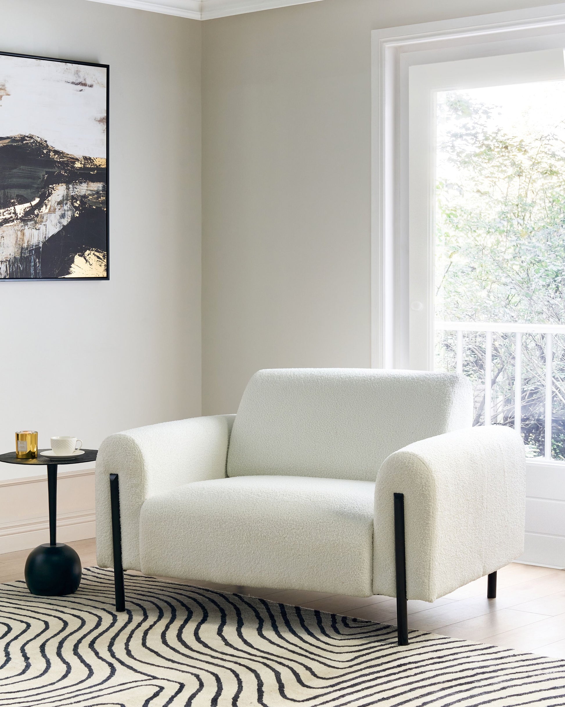Bei diesem verstellbaren Sessel wird nicht nur Stil und Langlebigkeit, sondern auch Sitzkomfort grossgeschrieben. Für das bequeme Sitzgefühl sorgt die dicke und angenehm weiche Polsterung sowie die individuell verschiebbare Rückenlehne, die es Ihnen erlaubt, die Tiefe der Sitzfläche zu regulieren. So können Sie Ihren Entspannungsort ganz nach Belieben anpassen. Zudem ist der Polstersessel mit einem strapazierfähigen Bouclé-Bezug versehen. Das Besondere an diesem Material ist seine angenehme Haptik sowie pflegeleichte, strukturierte Oberfläche. Die schlanken, schwarzen Metallbeine ergänzen das Design und verleihen dem Armsessel eine komfortable Sitzhöhe.  Material: Bouclé. Zusätzliches Material: Eukalyptus, Stahl.  Material Zusammensetzung: 100% Polyester Gewicht: 38 Montage: Beine / Füsse nicht montiert Holzart: Eucalyptus grandis Holzursprung: China Gewichtskapazität: 136 Polsterstärke: 30 Sitzhöhe: 45 Das Angebot beinhaltet: 1 x Sessel Sitzfläche: 83x58/90 Höhe: 79 zusätzliche Information: Um sicherzustellen, dass die Konstruktion stabil und die Nutzungssicherheit gewährleistet ist, sollte man 2 Wochen nach dem Zusammenbau überprüfen, ob die Ware auch korrekt montiert wurde. Ausserdem ist alle 3 Monate zu prüfen, ob die Schrauben richtig festgezogen sind. Breite: 123 Tiefe: 95/126 Art: Sessel Stil: Modern Allgemeine Farbe: Weiss Muster: Ohne Muster Hauptmaterial: Bouclé Füllmaterial: Schaumstoff Arm Stil: Gerade