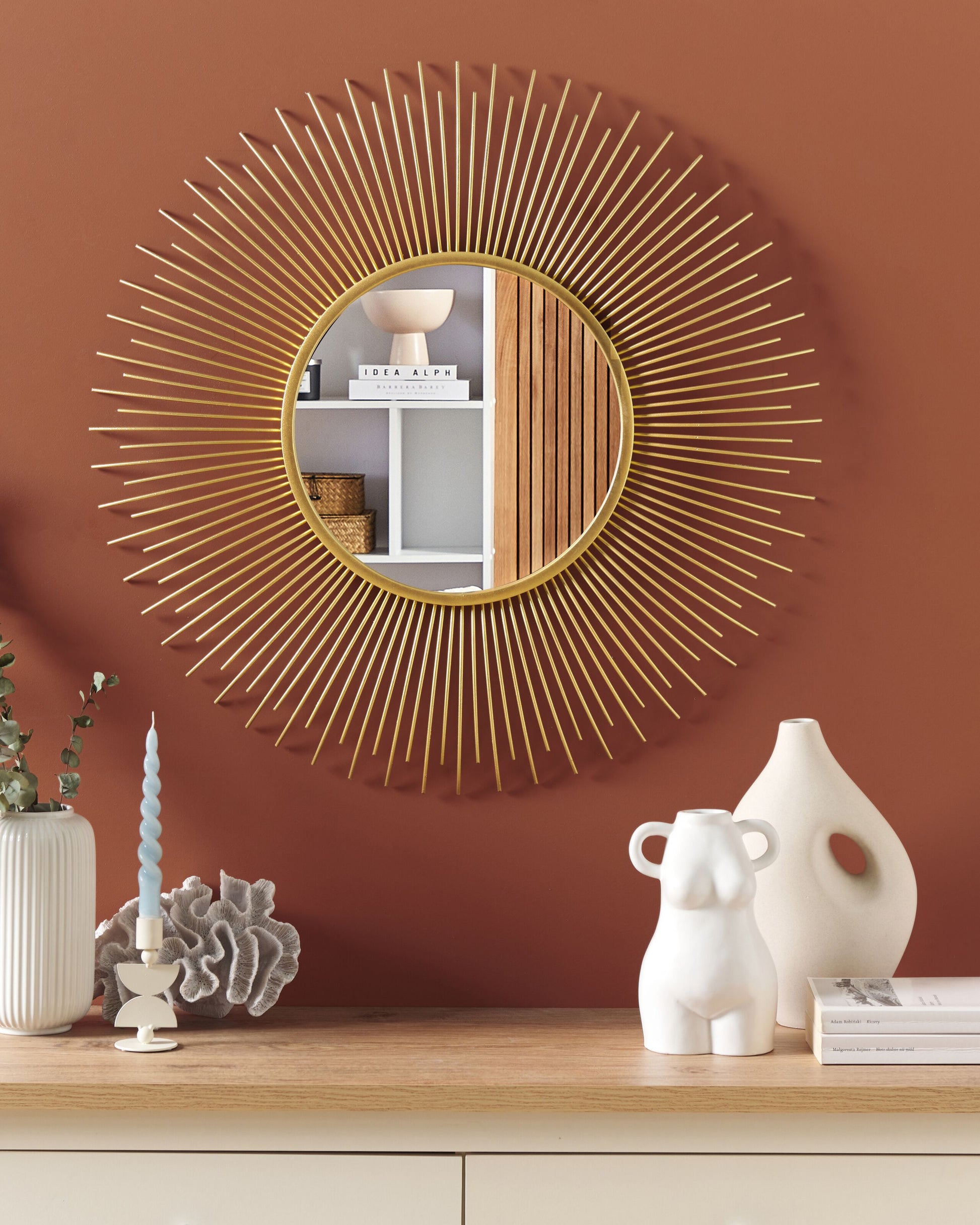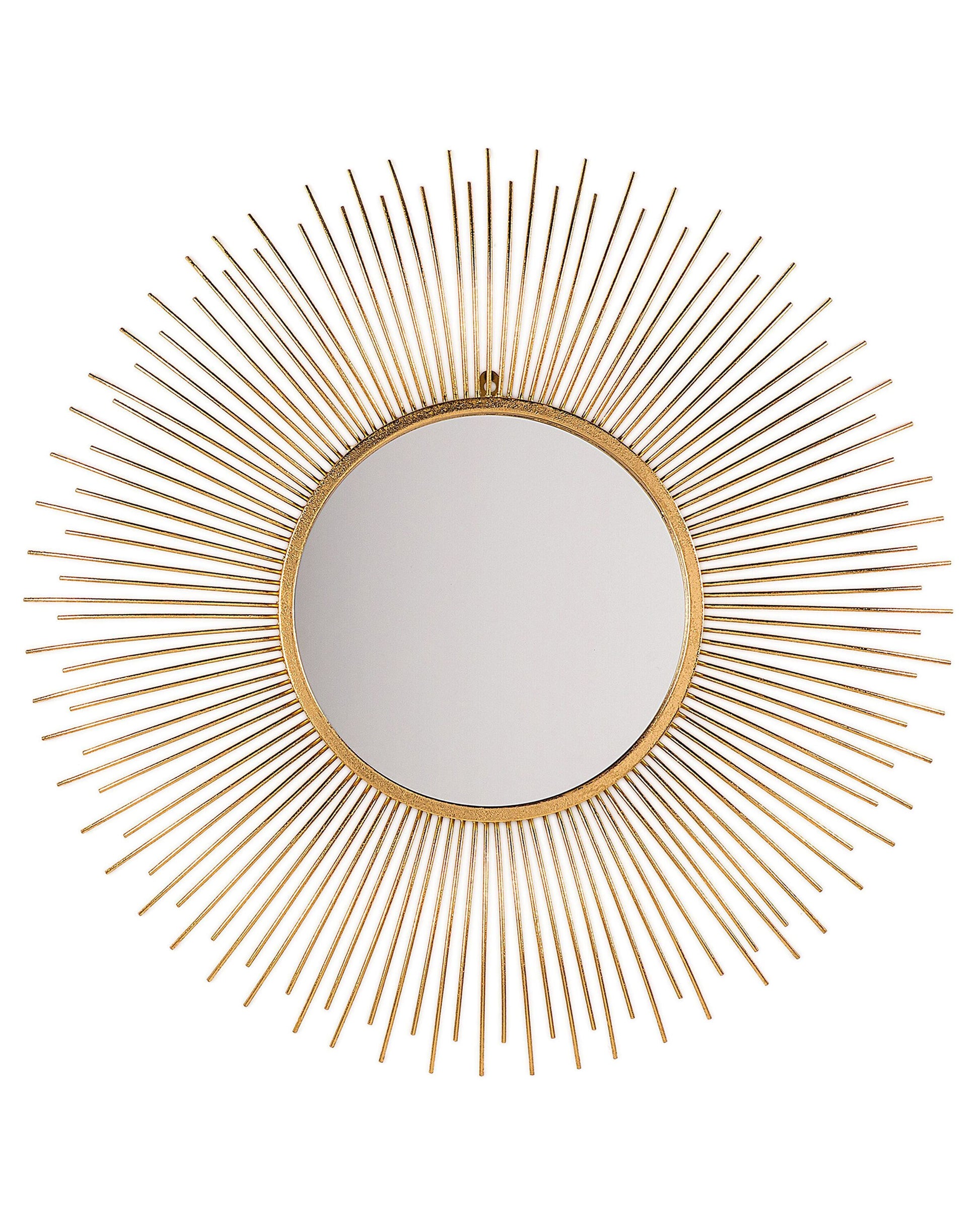 Beleben Sie jeden Raum mit dem bezaubernden Aussehen dieses runden Spiegels. Das auffällige Design des Strahlenkranz-förmigen Rahmens passt gut zu eklektischen, Vintage- und Boho-Stilen und schafft einen fröhlichen Akzent in Ihrem Zuhause. Der Wandspiegel kann sowohl als Dekoelement wie auch Schminkspiegel verwendet werden.    Material: Eisen. Zusätzliches Material: Glas.  Gewicht: 4 Montage: Benötigt keine Montage Das Angebot beinhaltet: 1 x Spiegel Höhe: 80 Gestalten: Rund Breite: 80 Tiefe: 3 Art: Wandspiegel Stil: Glamourös Allgemeine Farbe: Gold Hauptmaterial: Eisen
