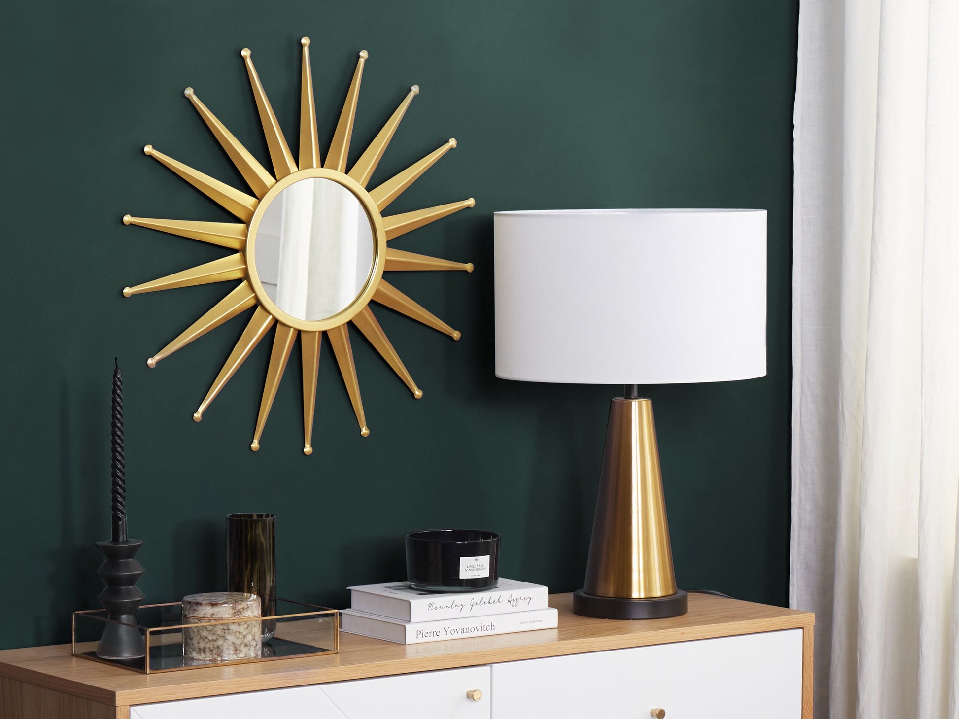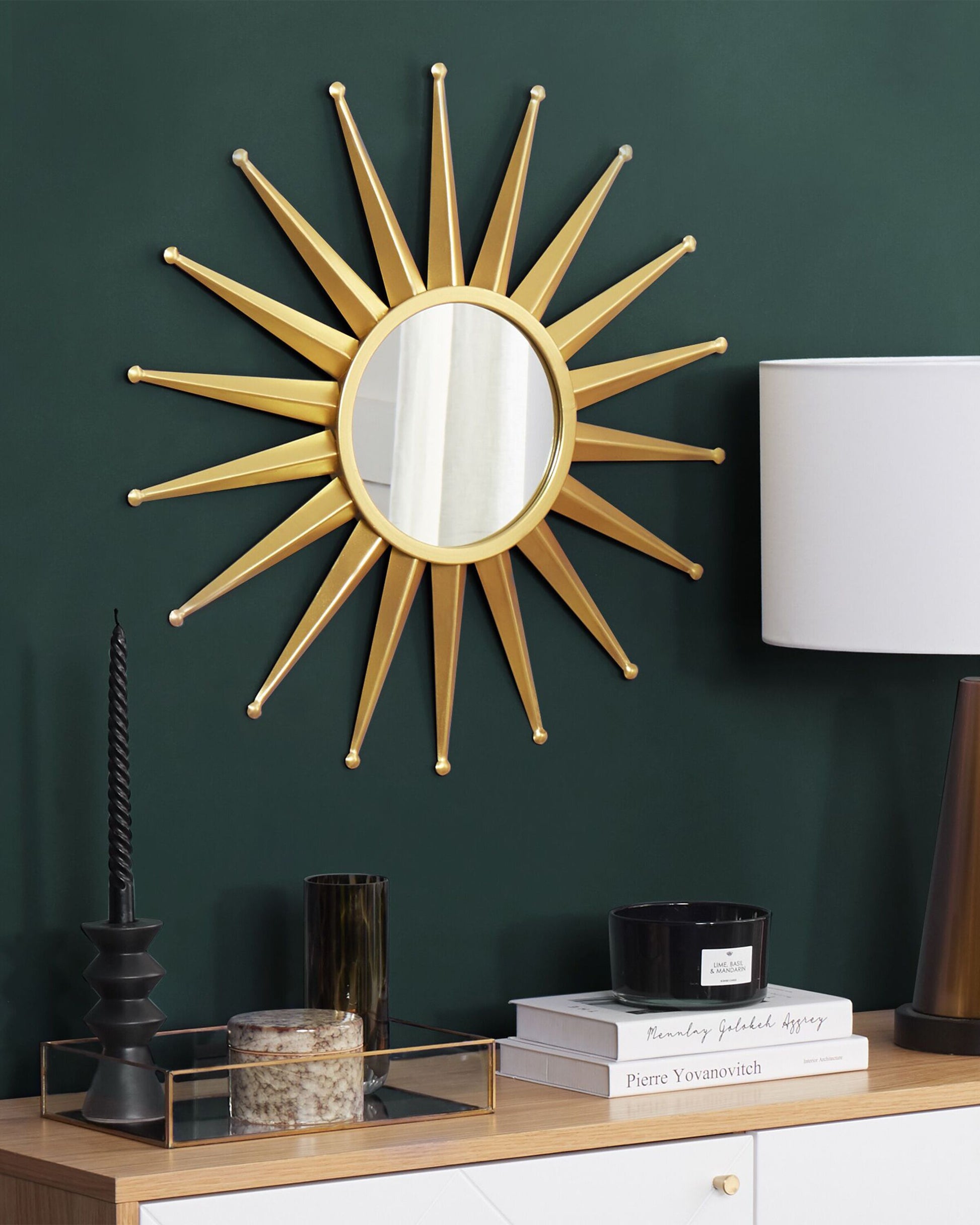 Mit diesem extravagantem Wohnaccessoire erstrahlt Ihre Wohnung in einem neuen Licht. Dieser wunderschöne Spiegel in Sonnenform vergrössert optisch den Raum und verleiht ihm dank der glänzenden, goldenen Farbe eine warme und gemütliche Atmosphäre. Praktisch und dekorativ zugleich.  Material: Eisen. Zusätzliches Material: Glas.  Gewicht: 2 Montage: Benötigt keine Montage Das Angebot beinhaltet: 1 x Spiegel Höhe: 60 Gestalten: Rund Breite: 60 Tiefe: 3 Art: Wandspiegel Stil: Glamourös Allgemeine Farbe: Gold Hauptmaterial: Eisen