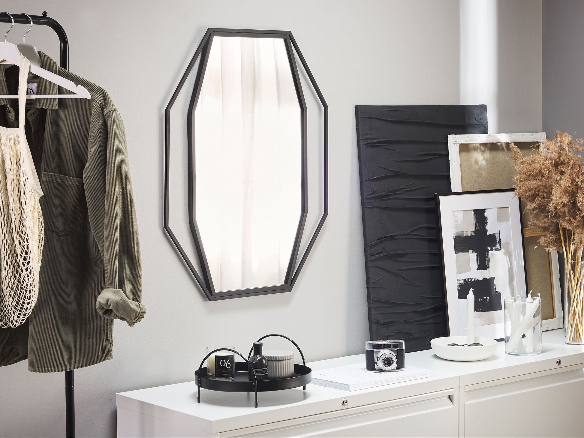 Das ideale Wohnaccessoire für alle, die nach einem einzigartigen Design und einer kreativen Einrichtung Ihrer Wohnung streben. Dieser achteckige Spiegel wird perfekt zu anderen Dekoartikeln in geometrischer Form passen. Zudem ist der Spiegel nicht nur für moderne, sondern auch für traditionelle Innenräume geeignet, wobei der graphitgraue Rahmen aus Stahl stets einen eleganten Charme ausstrahlt.    Material: Stahl. Zusätzliches Material: Glas.  Gewicht: 5 Montage: Benötigt keine Montage Das Angebot beinhaltet: 1 x Spiegel Höhe: 80 Gestalten: Achteckig Breite: 60 Tiefe: 3 Art: Wandspiegel Stil: Industriell Allgemeine Farbe: Grau Schatten: Graphitgrau Hauptmaterial: Stahl Orientierung: Vertikal