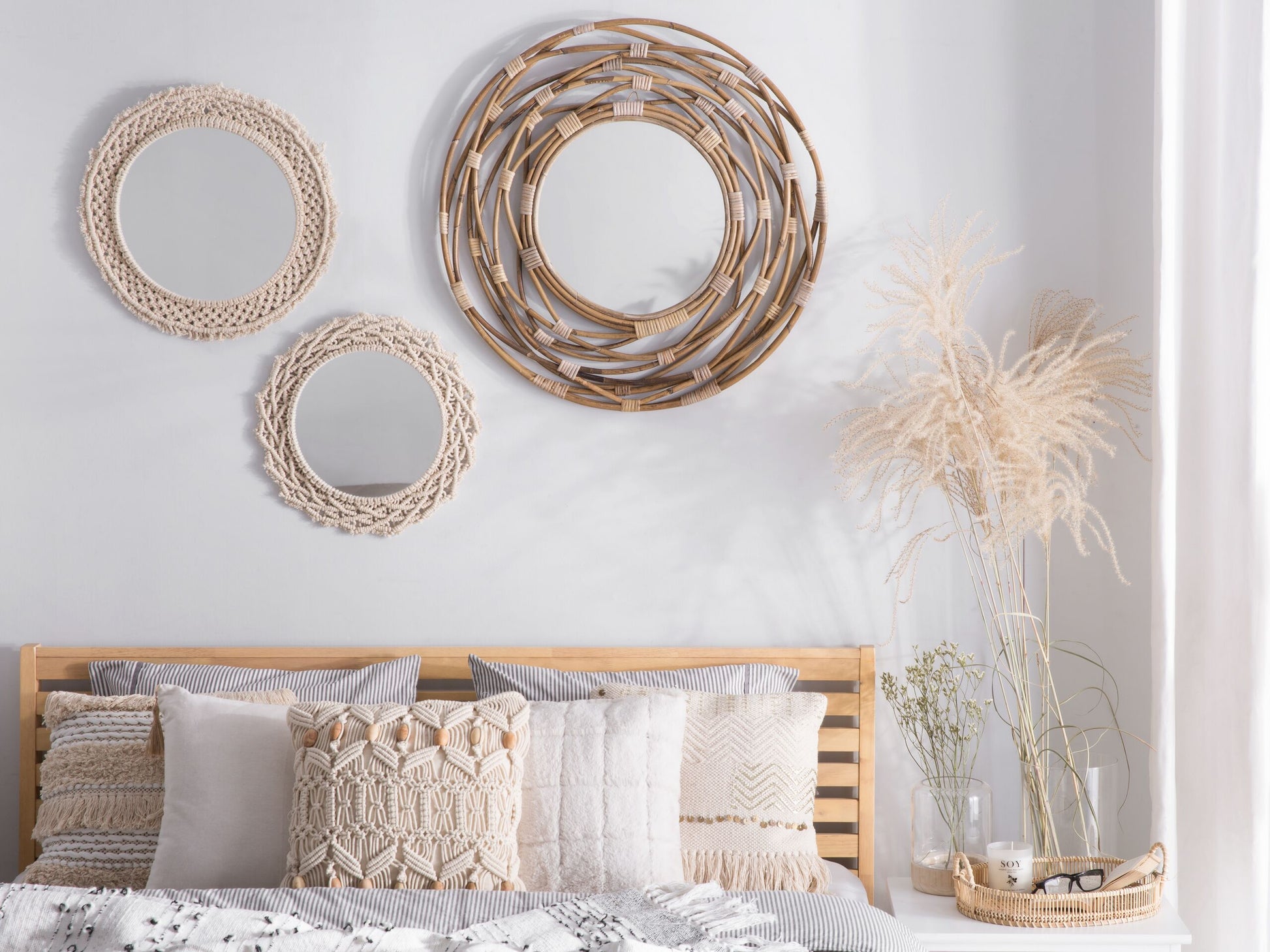 Überraschen Sie Ihre Gäste mit diesem originellen Spiegel aus Rattan. Die geflochtene Form des Rahmens verbindet Eleganz und Raffinesse und wird dadurch ein echtes Highlight in Ihrem Wohnambiente. Der aussergewöhnliche Look passt perfekt zu Räumen mit Vintage- oder Boho- Charme. Material: Rattan. Zusätzliches Material: Glas. Gewicht: 2 Montage: Benötigt keine Montage Das Angebot beinhaltet: 1 x Spiegel Höhe: 75 zusätzliche Information: Damit das folgende Produkt jahrelang seine Schönheit beibehält, stellen wir Ihnen ein ausführliches Pflegehandbuch zur Verfügung. Die Pflegeanleitung und Tipps zur richtigen Wartung Ihres neuen Produkts finden Sie finden Sie unten im Abschnitt „Verpackung und Montage“., Da bei der Herstellung natürliche Materialien verwendet werden, können kleine Farb-, Form-, bzw. Grössendifferenzen auftreten. Diese Unterschiede stellen jedoch keinen Produktfehler dar. Gestalten: Rund Breite: 75 Tiefe: 3 Art: Wandspiegel Stil: Boho Allgemeine Farbe: Braun Schatten: Sandbeige Hauptmaterial: Rattan