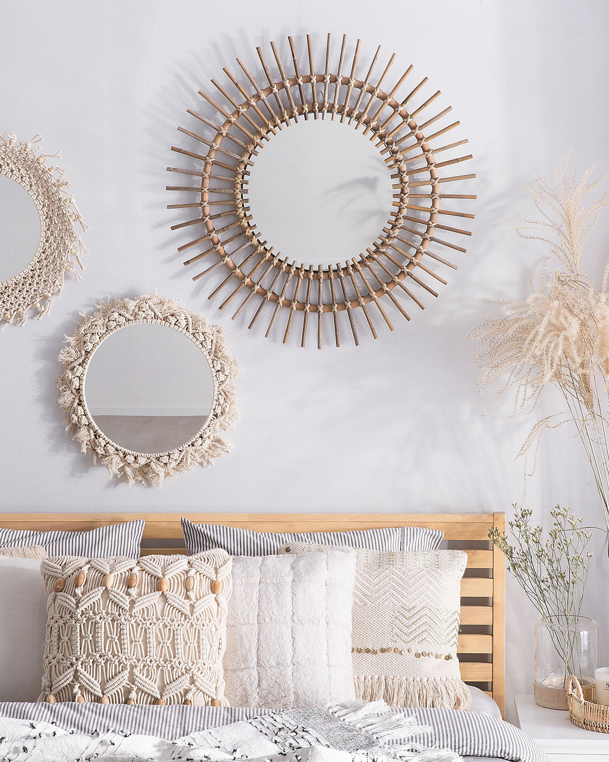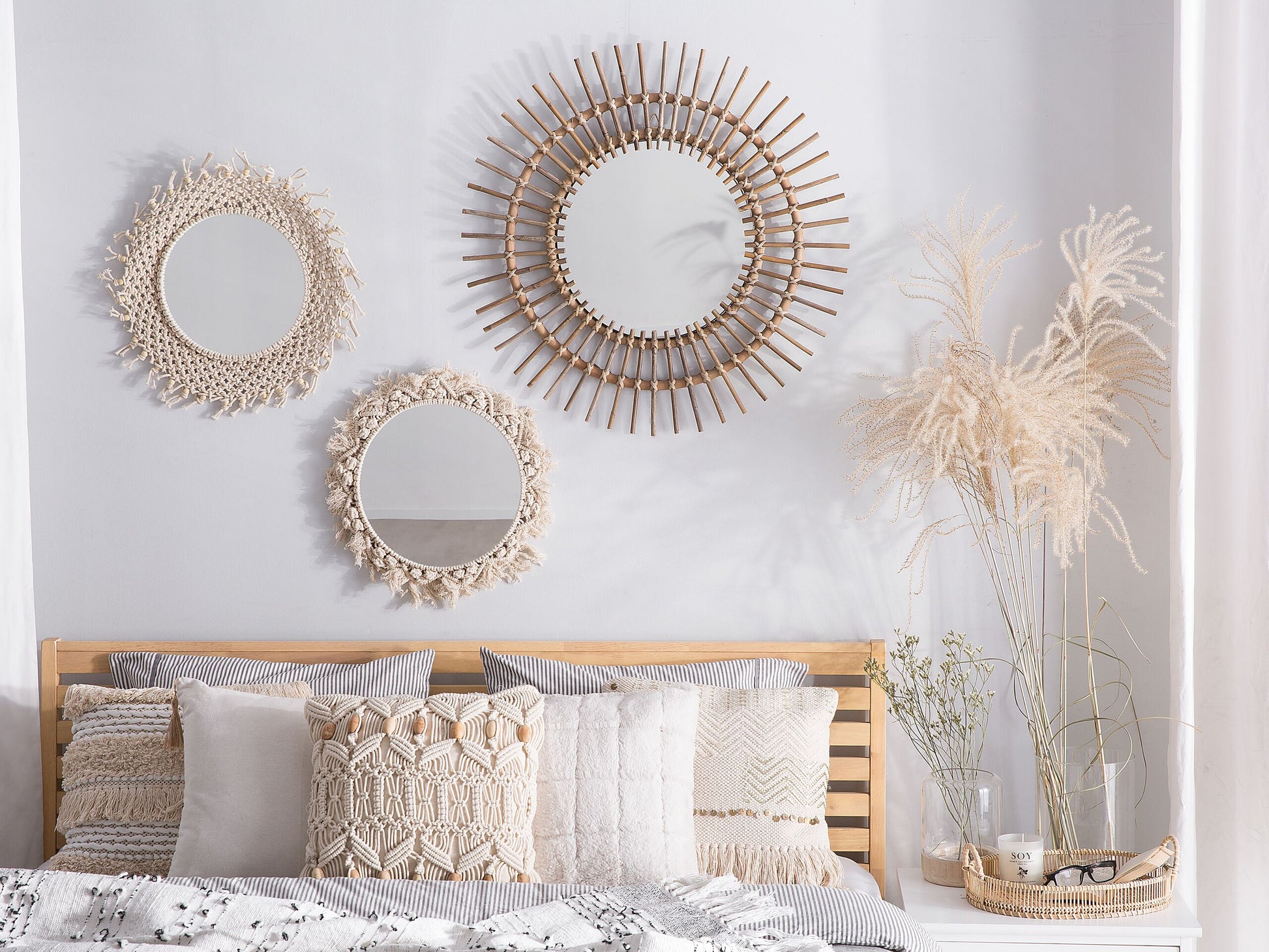 Bringen Sie ein bisschen Exzentrik in Ihr Wohnambiente und hängen Sie diesen Spiegel aus Rattan an die Wand Ihres Wohn- oder Schlafzimmers. Der elegante Rahmen in Sonnenform besitzt eine dezente, sandbeige Farbe und verleiht Ihrem Innenraum einen modernen Look. Dieses Wohnaccessoire ist ein ideales, dekoratives Element, das alle Blicke auf sich ziehen wird. Material: Rattan. Zusätzliches Material: Glas. Gewicht: 1 Montage: Benötigt keine Montage Das Angebot beinhaltet: 1 x Spiegel Höhe: 76 zusätzliche Information: Damit das folgende Produkt jahrelang seine Schönheit beibehält, stellen wir Ihnen ein ausführliches Pflegehandbuch zur Verfügung. Die Pflegeanleitung und Tipps zur richtigen Wartung Ihres neuen Produkts finden Sie finden Sie unten im Abschnitt „Verpackung und Montage“. Gestalten: Rund Breite: 76 Tiefe: 3 Art: Wandspiegel Stil: Boho Allgemeine Farbe: Braun Schatten: Sandbeige Hauptmaterial: Rattan