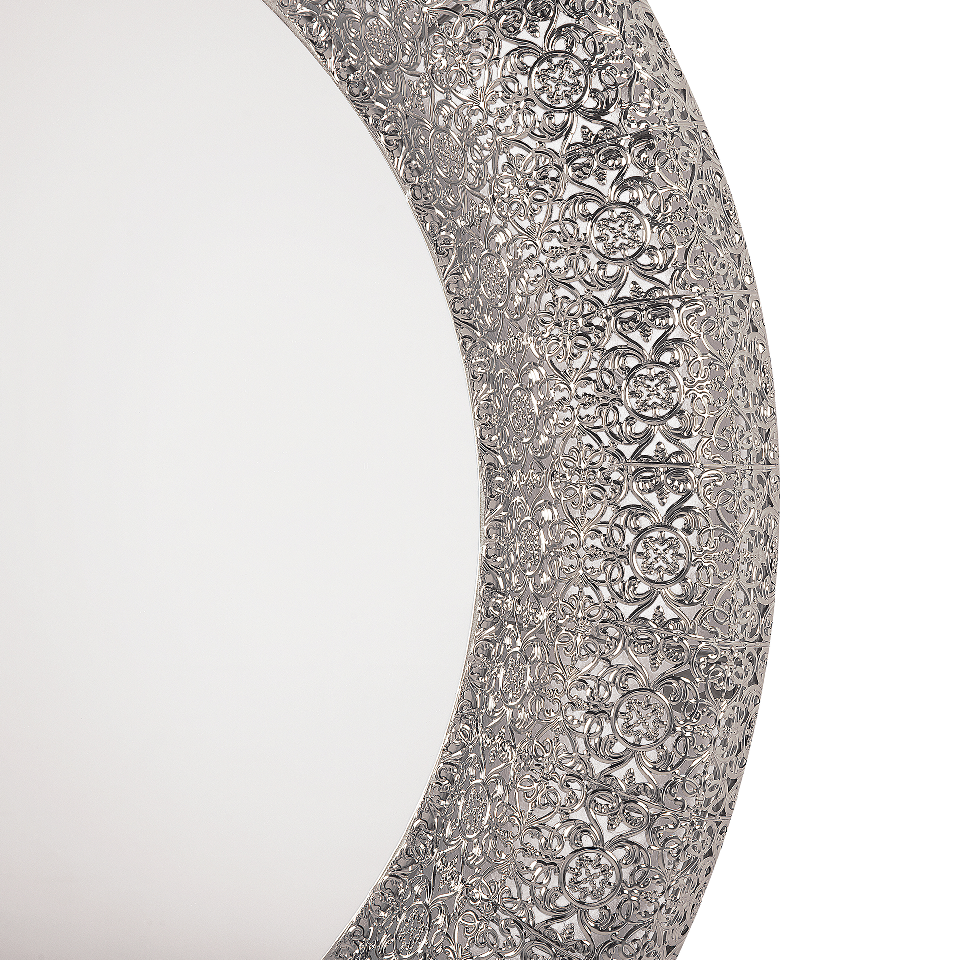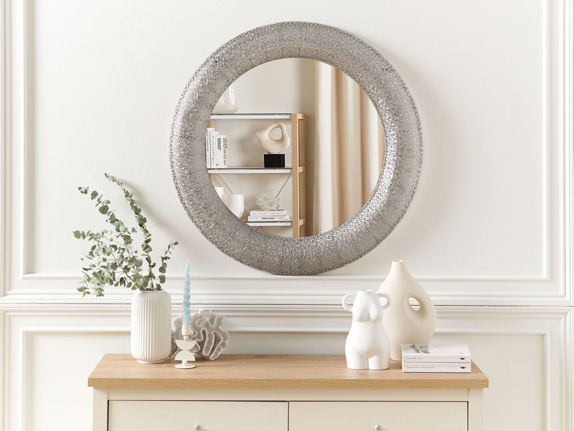 Dieser Wandspiegel verleiht jedem kleinen oder grossen Innenraum eine luxuriöse Atmosphäre.  Das elegante Design des silberfarbenen Rahmens passt wunderbar zu einer Vielzahl von Einrichtungsstilen, von minimalistisch bis Vintage. Mit seinem runden, strukturierten Rahmen ist der Spiegel eine perfekte Ergänzung für Ihr Ess-, Wohn- oder Schlafzimmer.   Material: Eisen. Zusätzliches Material: Glas.  Gewicht: 5 Montage: Benötigt keine Montage Das Angebot beinhaltet: 1 x Spiegel Höhe: 80 Gestalten: Rund Breite: 80 Tiefe: 5 Art: Wandspiegel Stil: Glamourös Allgemeine Farbe: Silber Hauptmaterial: Eisen