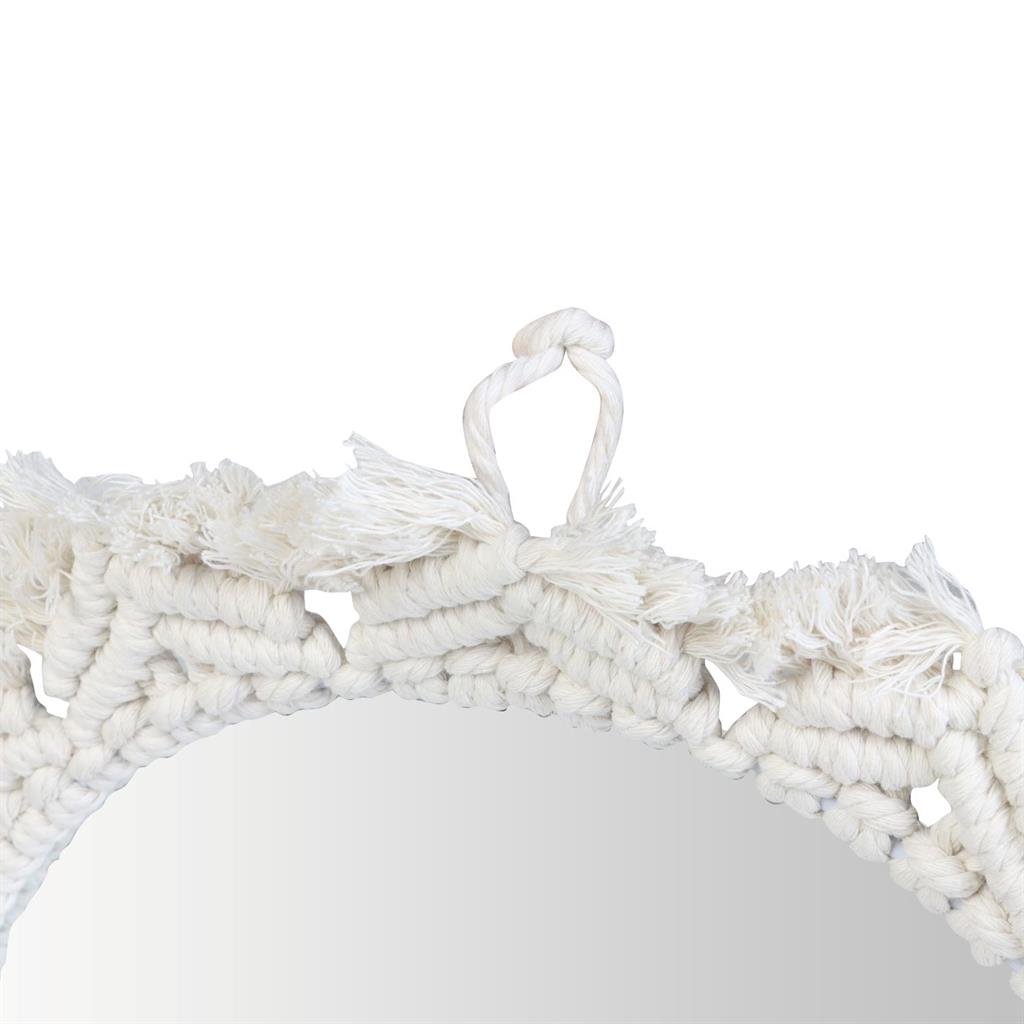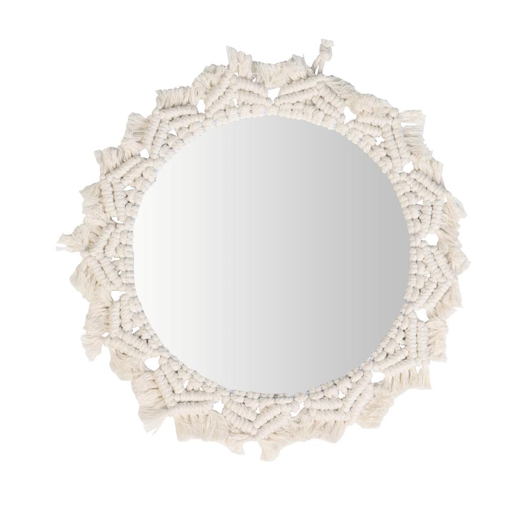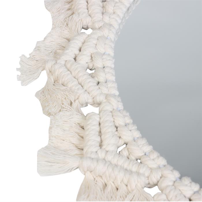 Questo specchio da parete ha la forma di un sole ed è circondato da una corda decorativa in cotone. Lo specchio ha un diametro di 30 cm e fornisce una riflessione chiara e senza distorsioni.