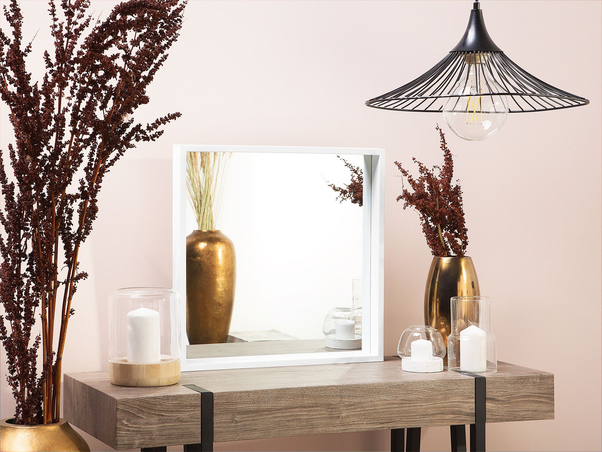 Den quadratischen Rahmen des Wandspiegels aus umweltfreundlichen Kunststoff bereichert eine besondere Maserung, deren Optik an eine Holzoberfläche erinnert. Er wird wird mit seiner schlichten Eleganz in Ihrem Heim eine sehr wohnliche Atmosphäre kreieren. Ob Sie ihn nun aufhängen oder auf einem Tisch stellen, er wird mit Sicherheit die nötige Helle in jeden Raum bringen und diesen auch optisch vergrössern. Material: Kunststoff. Zusätzliches Material: Glas. Gewicht: 4 Montage: Benötigt keine Montage Das Angebot beinhaltet: 1 x Spiegel Höhe: 50 Gestalten: Quadratisch Breite: 50 Tiefe: 4 Art: Wandspiegel Stil: Skandinavisch Allgemeine Farbe: Weiss Hauptmaterial: Kunststoff Orientierung: Vertikal