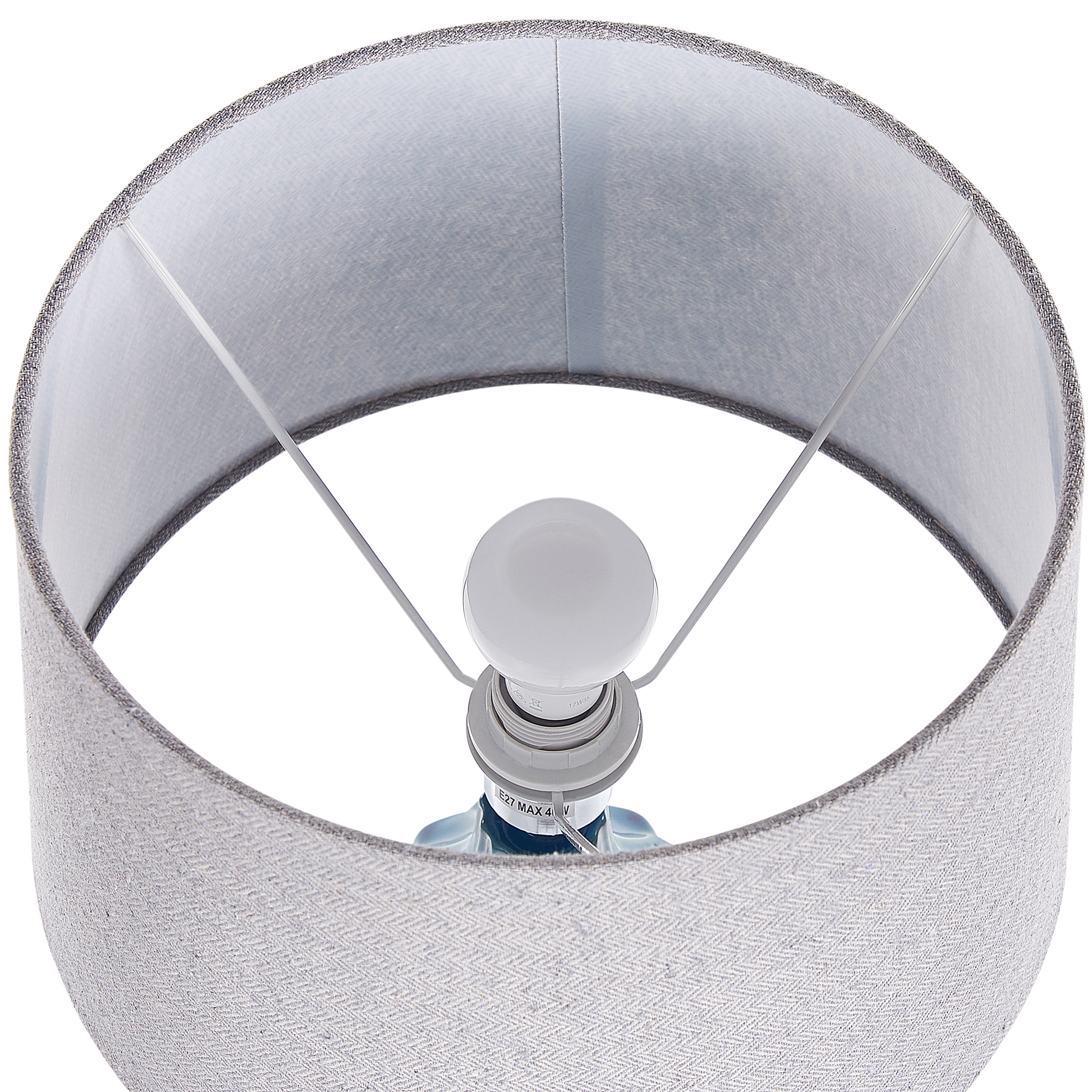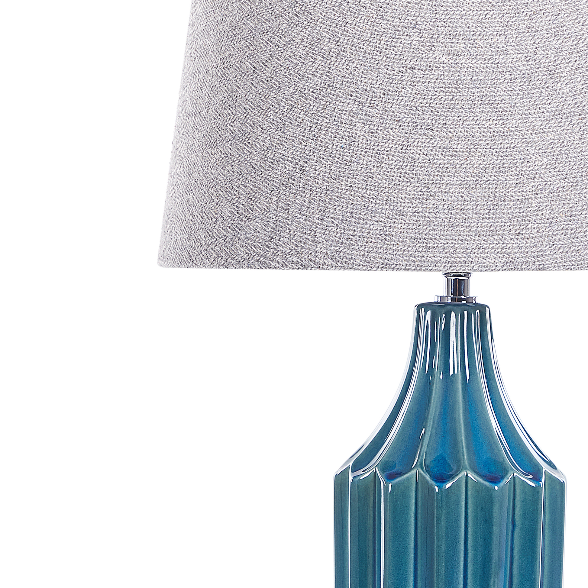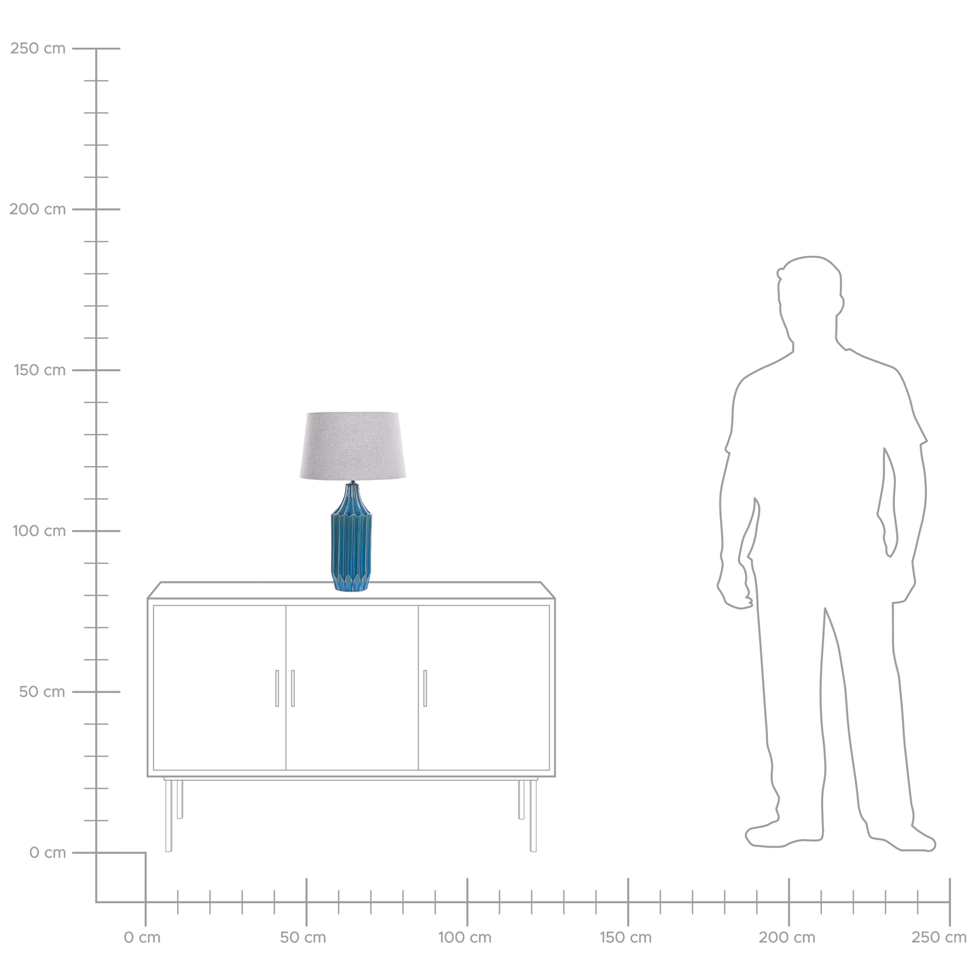 Diese blaue Lampe ist eine elegante Ergänzung für jeden Nachttisch, jede Kommode oder jedes Sideboard. Mit ihrem schönen gerippten Fuss ist sie ein funktionaler und dekorativer Akzent in jedem Wohnbereich. Der glänzende Sockel in Kombination mit dem grauen Schirm in Leinenoptik ist ein Stück, das Sie leicht in Ihren Raum einsetzen können. Material: Keramik. Zusätzliches Material: Baumwolle, Leinen. Material Zusammensetzung: 65% Leinen, 35% Baumwolle Gewicht: 2 Montage: Teilweise montiert Das Angebot beinhaltet: 1 x Tischleuchte, Nicht im Lieferumfang enthalten: Leuchtmittel Höhe: 56 zusätzliche Information: Diese Leuchte ist geeignet für Leuchtmittel der Energieklassen A bis G auf einer Skala von A (sehr effizient) bis G (weniger effizient). Geeignet für: LED Leuchtmittel, Eco-Halogen Leuchtmittel, Energiesparleuchtmittel., Die Stromkabel dürfen nur von einem qualifizierten Elektriker angepasst werden. Breite: 35 Tiefe: 35 Art: Tischleuchte Stil: Klassisch Allgemeine Farbe: Blau Schatten: Blaugrün Hauptmaterial: Keramik Fassung: Max. 40 W IP Protection Code: IP 20