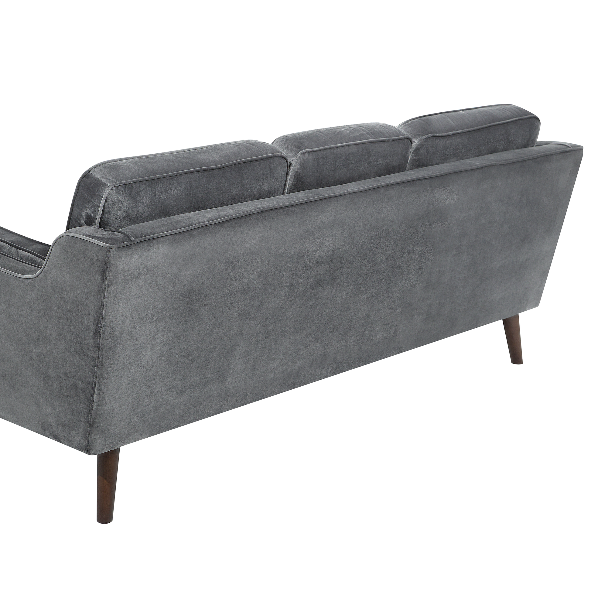 Schönes Design trifft auf optimalen Komfort - mit angenehm weichen Sitz-, Seiten- und Rückenkissen wird gemütliches Zusammensitzen zum puren Sitzvergnügen. Die schlanke Formgebung und der Bezug aus hochwertigem Samtstoff in edlem Dunkelgrau unterstreichen die elegante Ausstrahlung, die schrägen Beine aus robustem Eichenholz verleihen dem Sofa zugleich einen behaglichen Retro Touch. Der bequeme 3-Sitzer ist der ideale, zentrale Treffpunkt in jedem modernen, klassischen und individualistischen Wohnstil.  Material: Samtstoff. Zusätzliches Material: Eichenholz, Eukalyptus.  Material Zusammensetzung: 100% Polyester Gewicht: 45 Kapazität: 3 Personen Montage: Nicht montiert Holzart: Quercus mongolica Holzursprung: China Kissen Abmessungen: 63/51x46 Beine Höhe: 18 Polsterstärke: 11 Sitzhöhe: 39 Das Angebot beinhaltet: 1 x Dreisitzer Sitzfläche: 156x58 Höhe: 85 zusätzliche Information: Die Beine befinden sich in einer praktischen Tasche unter dem Sitz., Bitte beachten Sie, dass Samtstoff unter verschiedenen Lichtverhältnissen eine andere Optik haben kann – das Material schimmert bei Tageslicht stärker und wirkt bei künstlicher Beleuchtung in Innenräumen eher gedämpft. Aufgrund der glatten, hochdichten Struktur des Gewebes kann sein Farbton auch variieren, wenn man mit der Hand in verschiedene Richtungen und Winkel über den Stoff fährt. Um den Farbton auszugleichen und Druckstellen zu vermeiden, sollte der Webstoff sanft mit einer offenen Handfläche in eine Richtung gestrichen, mit einem feuchten Tuch abgewischt oder einem Dampfbügeleisen gebügelt werden. Breite: 204 Tiefe: 83 Art: 3 Sitzer Sofa Stil: Glamourös Allgemeine Farbe: Grau Schatten: Dunkelgrau Muster: Ohne Muster Hauptmaterial: Samtstoff Füllmaterial: Schaumstoff Arm Stil: Gerade