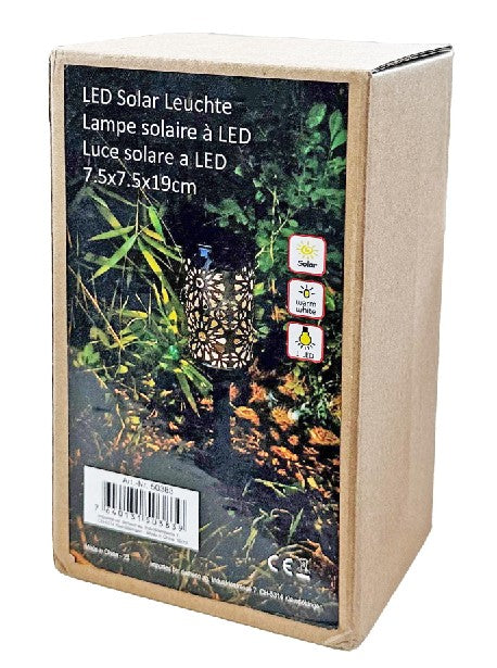 1 LED warm weiss mit Henkel (D8cm) Solar panel: polycristalline 35x35mm Batterie:1xAA 1.2V 200mAh Ni-MH ON/OFF switch Materialien: Metall (Stick aus Kunststoff) Grösse 7.4 x7.4 x 19cm (gesamt 39cm) witterungsbeständig inklusive VRB / CHF 00.25