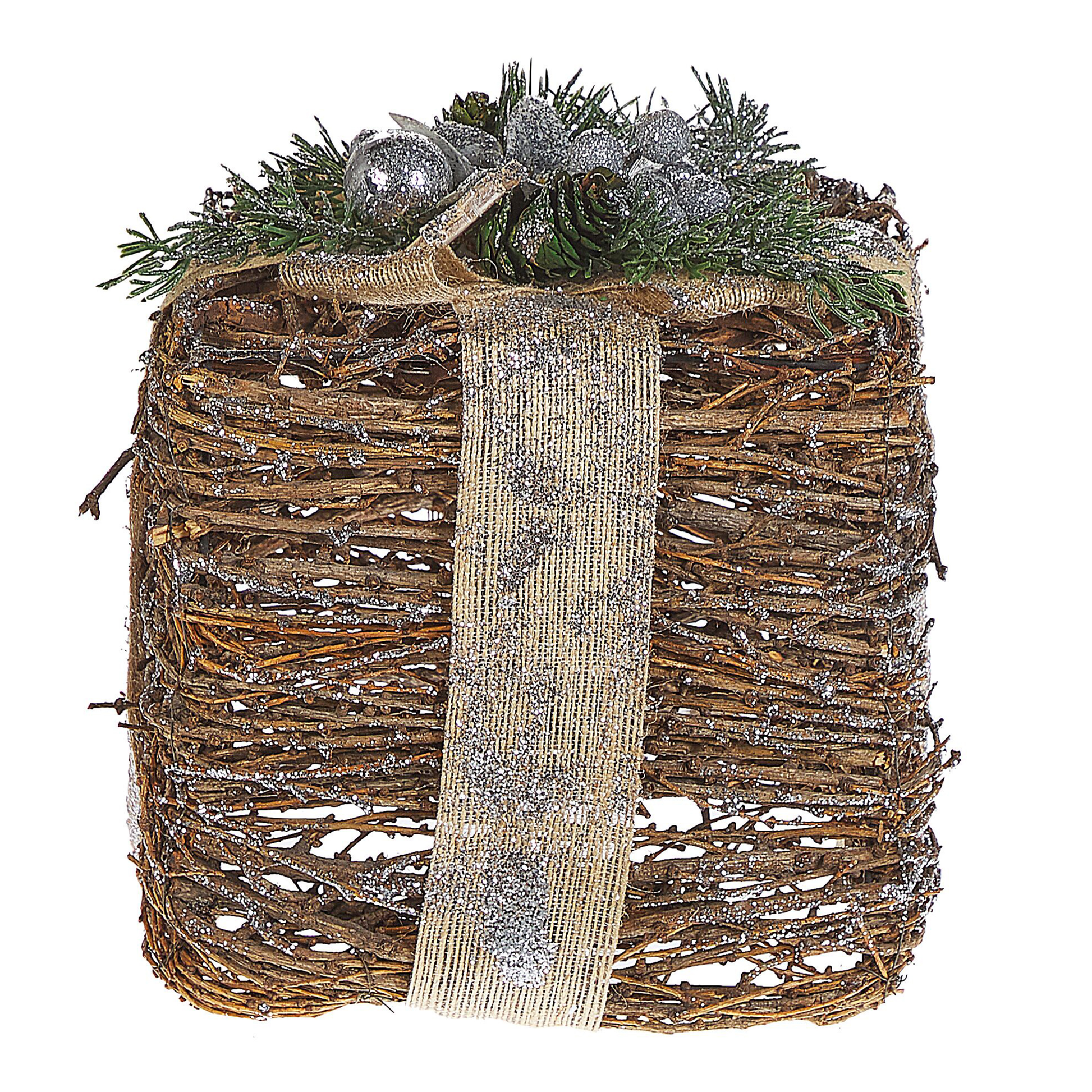 Beschreibung: Dank diesen Flecht Dekorationen geben Sie jeder Tischfläche eine weihnachtliche Ausstrahlung. Beide Deko Geschenke bestehen aus einem Metallgestell, das mit einem Rattangeflecht aufwändig umflochten wurde. Zusätzlich, wurden sie mit einer Schleife, Kunststoffzweigen, -blumen und -beeren in Silber dekoriert. Der schimmernde Glitterstaub und der natürlich schöne Rattan-Farbton tauchen jeden Wohnraum in eine bezaubernde Weihnachtsstimmung. Das Set kann zusammen oder auch einzeln aufgestellt werden und gerne mit anderen Dekorationen kombiniert werden. Material: Rattan. Zusätzliches Material: Kunststoff, Metall. Gewicht: 1 Montage: Benötigt keine Montage Das Angebot beinhaltet: 2 x Dekoration Höhe: 28/21 zusätzliche Information: Da jedes Produkt handgefertigt wird, kann es zu kleineren Abweichungen in der Farbe und der äusseren Struktur kommen. Diese Abweichungen stellen keinen Qualitätsmangel dar, sondern sind eine warentypische Eigenschaft. Breite: 29/19 Tiefe: 29/19 Art: Dekofigur Stil: Klassisch Allgemeine Farbe: Naturfarben Hauptmaterial: Rattan
