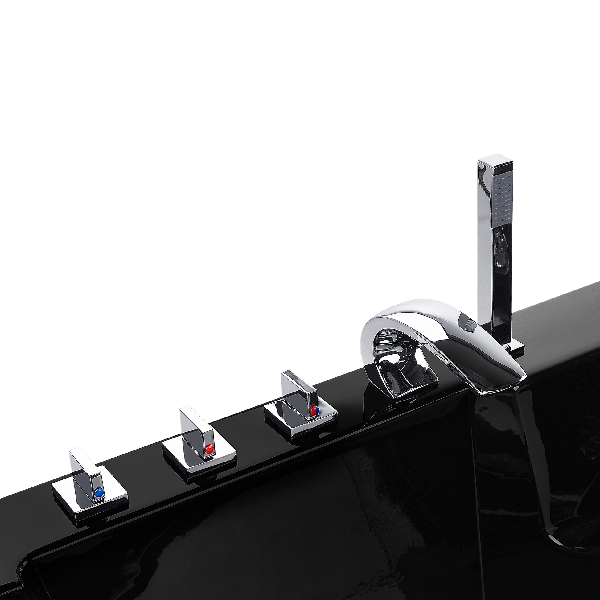 Mit dieser funktionellen Badewanne wird Ihr Traum vom Wohlfühlbad wahr! Die 4 grossen Massagedüsen garantieren Entspannung pur und die Unterwasserbeleuchtung in 7 verschiedenen Farbtönen sorgt zusätzlich für eine Lichttherapie. Gefertigt ist die Eckwanne aus hochwertigem Sanitäracryl mit grossen, seitlichem Blickfenster, welches ihr eine Leichtigkeit in modernem Stil verleiht. Material: Acryl. Zusätzliches Material: Stahl, Sicherheitsglas, Kunststoff. Gewicht: 98 Kapazität: 1 Person Montage: Die Montage sollte durch einen qualifizierten Fachmann erfolgen Gewichtskapazität: 200 Das Angebot beinhaltet: Inkl. Abflussrohr, 1 x Whirlpool, 1 x Überlaufsystem, 1 x Wasserfall Armatur, 1 x Handbrause mit Schlauch Höhe: 59 zusätzliche Information: Der Anschluss an das Stromnetz darf ausschliesslich von autorisiertem und qualifiziertem Personal durchgeführt werden., Um Transportschäden zu vermeiden, sind die Whirlpools nicht zu 100%, sondern nur zu 85% vormontiert! Das Abdichten und Kontrollieren der Leitungen, Sichtfenster und Düsen durch einen Sanitär liegt in der Verantwortung des Kunden., Vor der Benutzung der Massagefunktion muss die Wanne mit Wasser gefüllt werden, damit die Pumpe nicht beschädigt wird., Geeignete Schläuche sollten von einem Fachmann vor Ort erworben und angeschlossen werden. Es dürfen auf keinen Fall die vom Verkäufer gelieferten Anschlussschläuche verwendet werden., Alle Anschlüsse müssen entsprechend dieser Bedienungsanleitung und den in Ihrem Land gültigen Normen durchgeführt werden., Bitte beachten Sie, dass die Seriennummer des Modells sowohl auf dem Wannenrahmen als auch auf der Verpackung aufgeführt ist. Die Seriennummer sollte aufbewahrt werden, da sie im Falle einer Nachlieferung von Ersatzteilen oder bei Garantieansprüchen erforderlich ist., Alle Schläuche müssen von einem Fachmann vor Inbetriebnahme und danach in regelmässigen Abständen überprüft und abgedichtet werden. Die Schläuche können sich während des Transports oder mit der Zeit lösen., Sollte ein Defekt vorliegen, ist der Kunde für den Aus- und Wiedereinbau der defekten Teile verantwortlich., Kunden in der Schweiz und England müssen einen länderspezifischen Stecker montieren. Gestalten: Dreieckig Breite: 135 Länge: 190 Art: Whirlpool Badewanne Eckmodell mit LED Stil: Modern Allgemeine Farbe: Schwarz Hauptmaterial: Acryl Leistung: 750 W