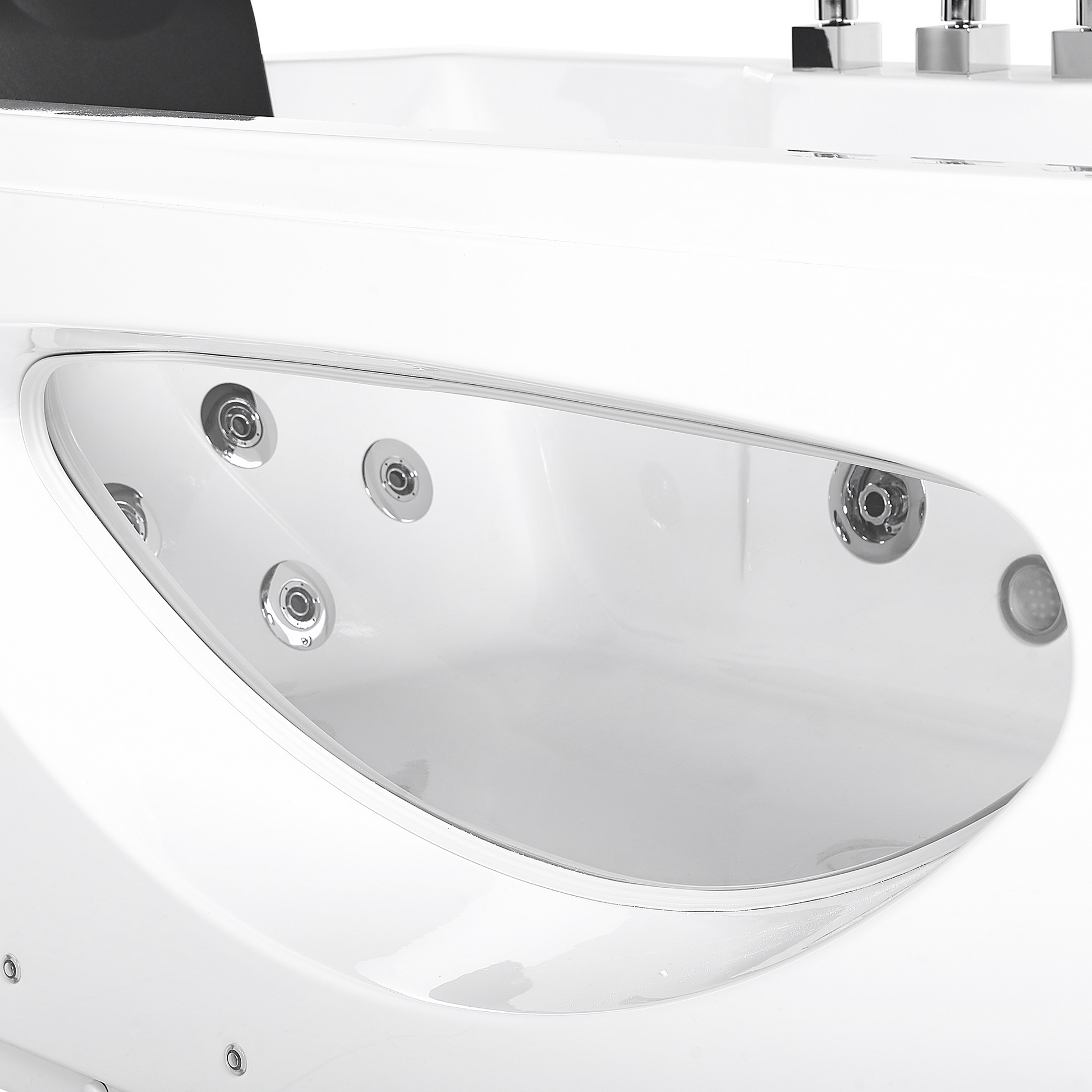 Dieses Modell verbindet eine klassische Form mit einem luxuriösen Design und funktionaler Technik. Dank des integrierten Mittelablaufes und der zwei schwarzen Nackenstützen aus Kunstleder ist Liegen auf beiden Seiten möglich. Wassereinlass über Handbrause mit ausziehbarem Schlauch oder Wasserhahn. Das Massagesystem verwöhnt und sorgt für ein tolles Sprudelvergnügen. Das Highlight bilden die 8 LED Lichter an der Aussenverkleidung sowie die integrierte Unterwasserbeleuchtung in 7 Farben. Material: Acryl. Zusätzliches Material: Sicherheitsglas, Kunstleder, Messing. Gewicht: 98 Kapazität: 2 Personen Montage: Die Montage sollte durch einen qualifizierten Fachmann erfolgen Gewichtskapazität: 235 Das Angebot beinhaltet: Inkl. Abflussrohr, 1 x Whirlpool, 1 x Überlaufsystem, 1 x Handbrause mit Schlauch, 2 x Kopfstützen, 1 x Wasserhahn Höhe: 58 zusätzliche Information: Der Anschluss an das Stromnetz darf ausschliesslich von autorisiertem und qualifiziertem Personal durchgeführt werden., Alle Anschlüsse müssen entsprechend dieser Bedienungsanleitung und den in Ihrem Land gültigen Normen durchgeführt werden., Um Transportschäden zu vermeiden, sind die Whirlpools nicht zu 100%, sondern nur zu 85% vormontiert! Das Abdichten und Kontrollieren der Leitungen, Sichtfenster und Düsen durch einen Sanitär liegt in der Verantwortung des Kunden., Vor der Benutzung der Massagefunktion muss die Wanne mit Wasser gefüllt werden, damit die Pumpe nicht beschädigt wird., Geeignete Schläuche sollten von einem Fachmann vor Ort erworben und angeschlossen werden. Es dürfen auf keinen Fall die vom Verkäufer gelieferten Anschlussschläuche verwendet werden., Bitte beachten Sie, dass die Seriennummer des Modells sowohl auf dem Wannenrahmen als auch auf der Verpackung aufgeführt ist. Die Seriennummer sollte aufbewahrt werden, da sie im Falle einer Nachlieferung von Ersatzteilen oder bei Garantieansprüchen erforderlich ist., Alle Schläuche müssen von einem Fachmann vor Inbetriebnahme und danach in regelmässigen Abständen überprüft und abgedichtet werden. Die Schläuche können sich während des Transports oder mit der Zeit lösen., Sollte ein Defekt vorliegen, ist der Kunde für den Aus- und Wiedereinbau der defekten Teile verantwortlich., Kunden in der Schweiz und England müssen einen länderspezifischen Stecker montieren. Gestalten: Rechteckig Breite: 80 Länge: 180 Art: Whirlpool Badewanne Eckmodell mit LED Stil: Modern Allgemeine Farbe: Weiss Hauptmaterial: Acryl Leistung: 750 W